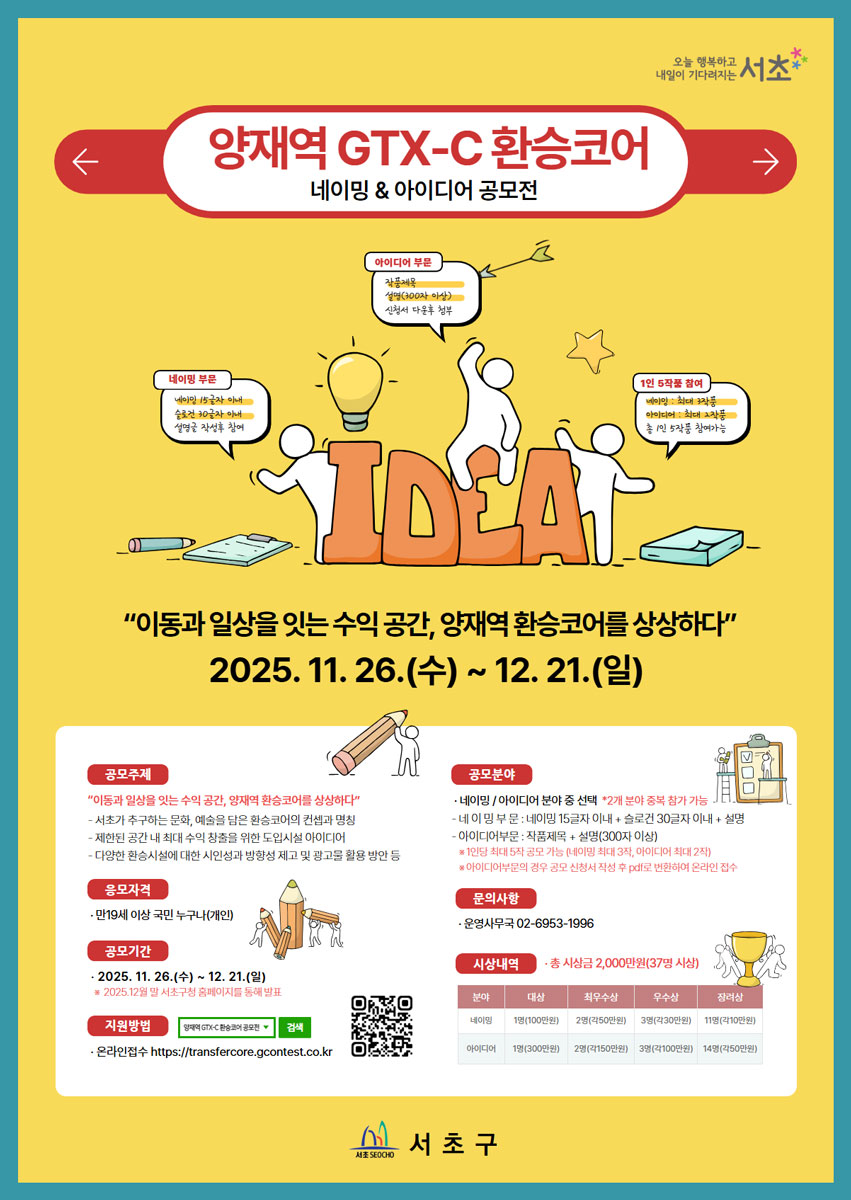 • 모집 기간: 2025년 11월 26일 ~ 2025년 12월 21일 • 참여 대상: 만 19세 이상 국민 누구나 (개인) • 참여 방법: 서초구 홈페이지에서 참가신청서 작성 후 공모전 홈페이지에 온라인 접수 • 시상 내역: 총 2,000만원 상금 (총 37명 시상) • 문의: 02-6953-1996 서초구에서 양재역 GTX-C 환승코어 네이밍 및 아이디어를 공모합니다. 환승코어를 더 창의적이고 매력적인 공간으로 만들기 위한 아이디어를 기다립니다. 네이밍과 아이디어 분야 중 선택하여 참여 가능하며, 중복 참여도 가능합니다.