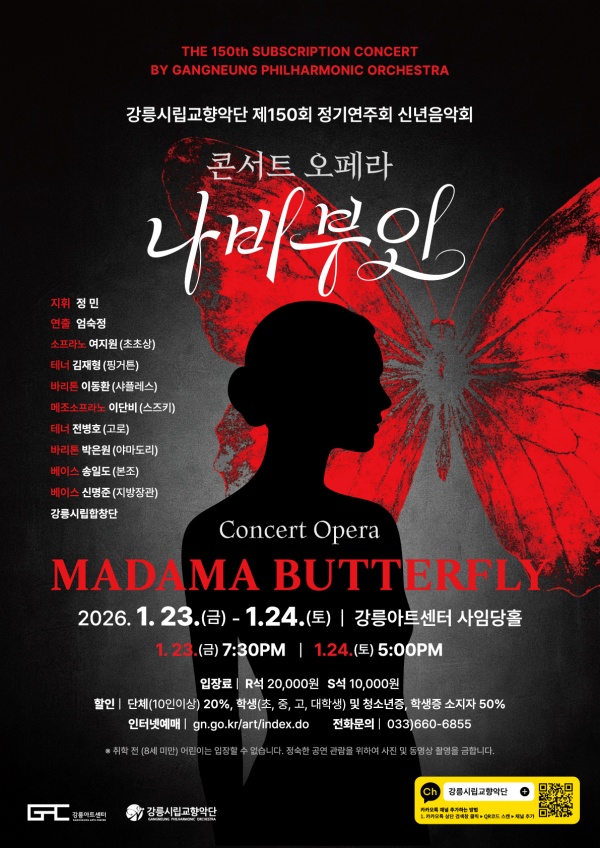 • 기간: 2026.01.23 ~ 2026.01.24 • 장소: 강릉아트센터 사임당홀 (대공연장) • 관람 등급: 만 7세 이상 • 티켓 가격: R석 20,000원, S석 10,000원 강릉아트센터에서 푸치니의 오페라 '나비부인'이 공연됩니다. 금요일 저녁과 토요일 오후, 아름다운 선율과 감동적인 이야기를 강릉에서 만나보세요. 만 7세 이상 관람 가능하며, 티켓은 R석과 S석으로 나뉘어 판매됩니다.
