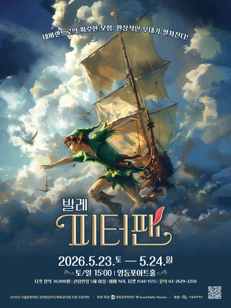 • 기간: 2026.05.23 ~ 2026.05.24 • 대상: 만 4세 이상 관람가 • 장소: 영등포아트홀 • 혜택: 일반석 30,000원 및 2열 할인석 20,000원 영등포아트홀에서 기획한 무용 공연 피터팬이 무대에 오릅니다. 서양 무용과 한국 무용이 어우러진 독특한 장르로 구성되어 온 가족이 함께 즐길 수 있는 무대를 선사합니다. KOPIS 공식 정보를 바탕으로 하며 상세 예매는 공식 예매처를 통해 확인 가능합니다.