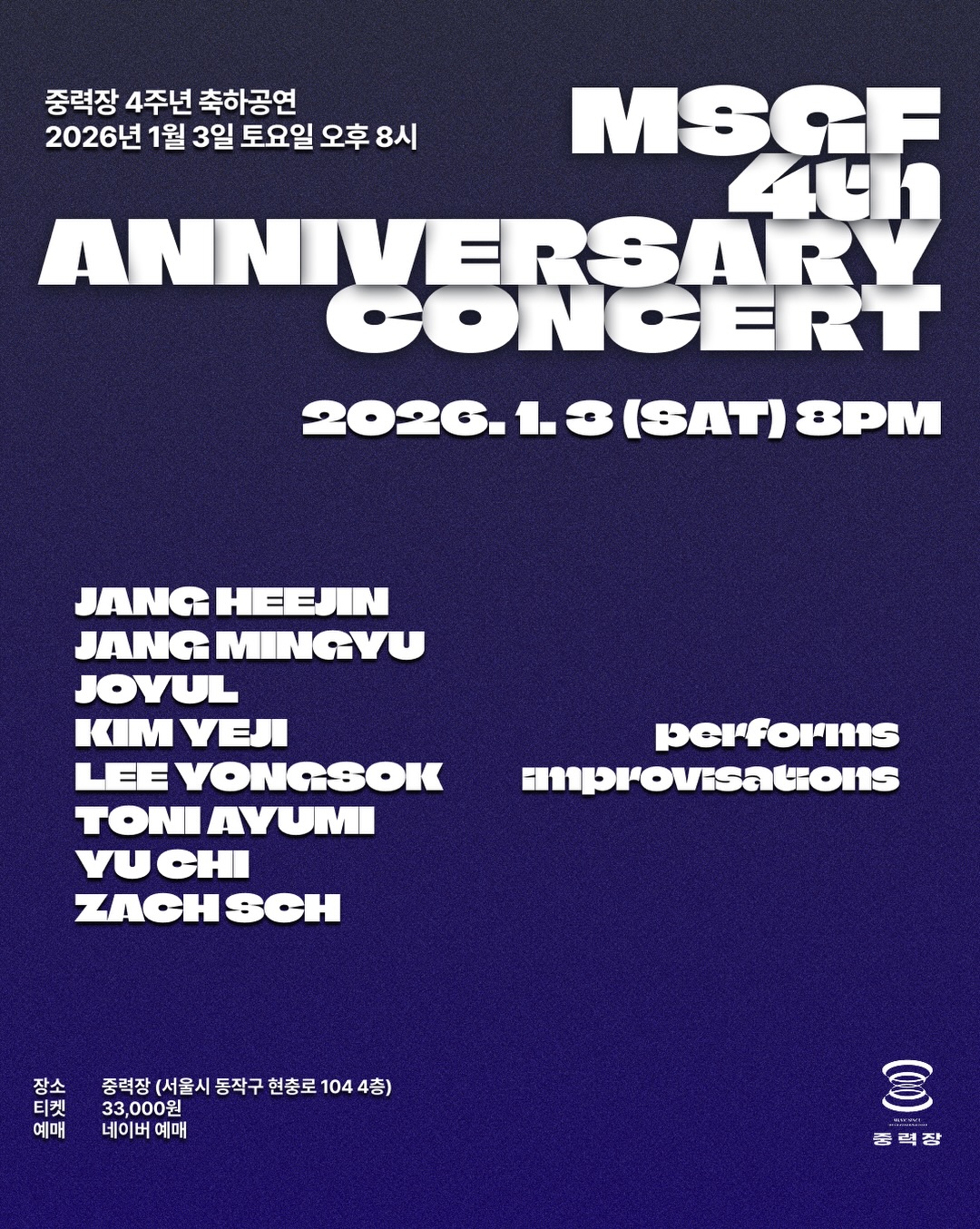 • 기간: 2026.01.03 • 장소: 음악공간 중력장 (서울특별시 동작구 현충로 104) • 관람 등급: 전체 관람가 • 티켓 가격: 33,000원 음악공간 중력장의 4주년을 기념하는 특별한 공연이 2026년 1월 3일에 개최됩니다. 다양한 장르의 대중음악을 즐길 수 있는 이번 공연은 모든 연령대가 함께 즐길 수 있으며, 잊지 못할 추억을 선사할 것입니다. 자세한 내용 및 예매는 공식 예매처를 통해 확인하세요.