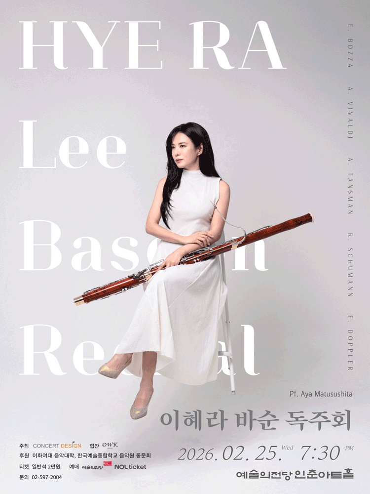 • 기간: 2026.02.25 ~ 2026.02.25 • 대상: 만 7세 이상 관람객 • 장소: 예술의전당 인춘아트홀 • 혜택: 전석 20,000원 관람 가능 바순 연주자 이혜라가 선사하는 클래식 독주회가 예술의전당 인춘아트홀에서 개최됩니다. 바순 특유의 깊고 풍부한 음색을 통해 정통 서양음악의 정수를 경험할 수 있는 특별한 무대입니다.