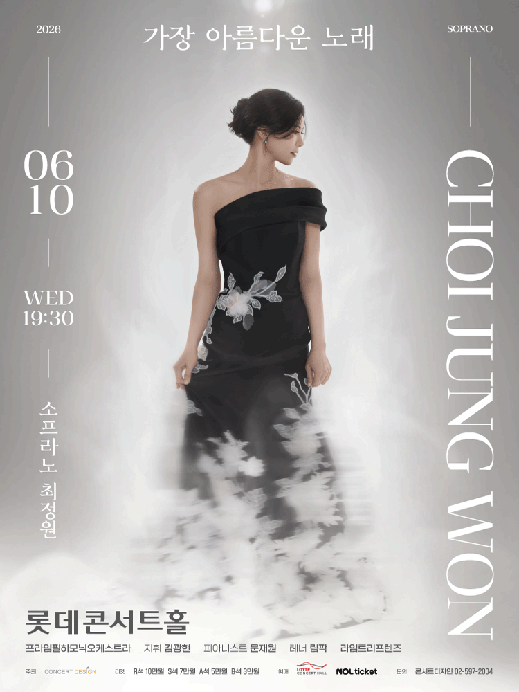 • 기간: 2026.06.10 ~ 2026.06.10 • 대상: 만 7세 이상 관람가 • 장소: 롯데콘서트홀 • 혜택: R석 100,000원, S석 70,000원, A석 50,000원, B석 30,000원 등 소프라노 최정원이 선사하는 가장 아름다운 선율을 롯데콘서트홀 무대에서 직접 감상할 수 있는 클래식 공연입니다. 2026년 6월 10일 단 하루 동안 진행되며 정통 성악의 깊은 매력과 감동을 관객들에게 전달할 예정입니다. 다양한 가격대의 좌석이 마련되어 있으니 공식 예매처를 통해 상세한 좌석 정보와 예매 일정을 확인하시기 바랍니다.