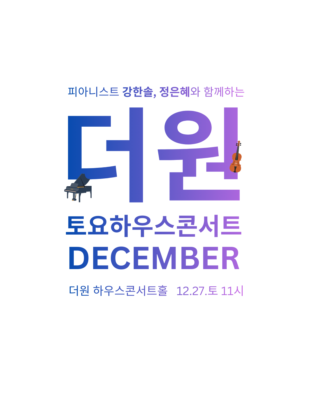 • 기간: 2025.12.27 • 대상: 전체 관람가 • 장소: 더원하우스콘서트홀 (부산 해운대구) • 가격: 전석 10,000원 피아니스트 강한솔, 정은혜 님의 아름다운 피아노 선율을 더원하우스콘서트홀에서 만나보세요. 토요일 오전, 클래식 음악의 향연이 펼쳐집니다. 해운대역 인근에 위치한 더원하우스콘서트홀에서 특별한 시간을 경험하세요.