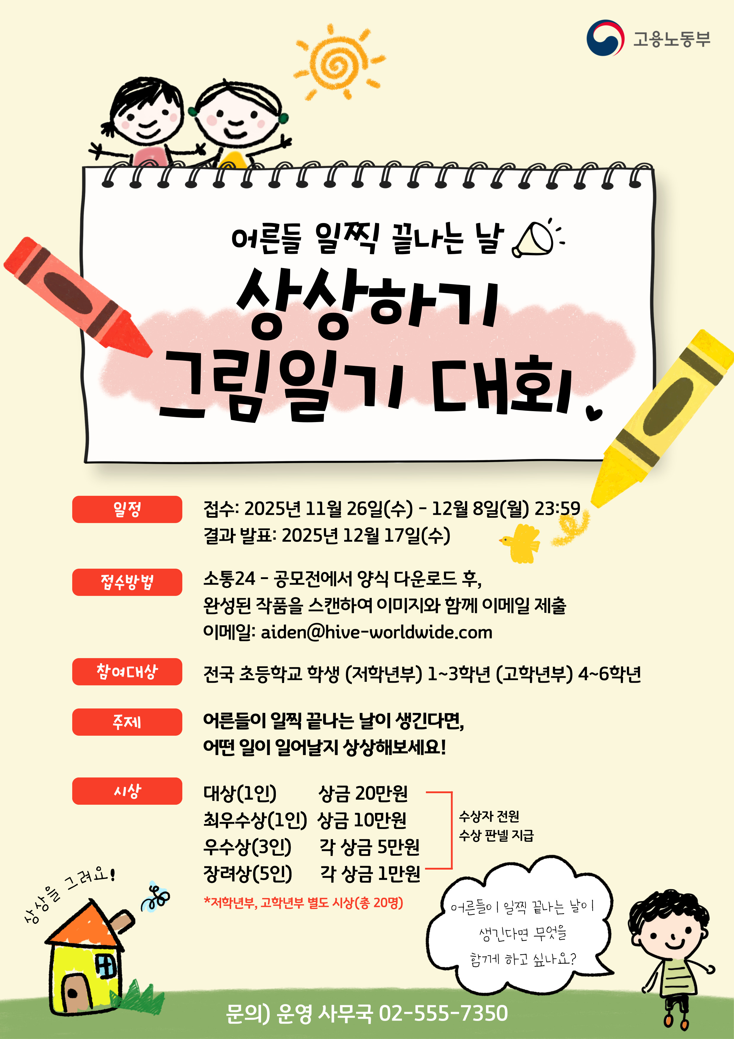 • 참여 기간: 2025년 11월 26일 ~ 12월 8일 23:59 • 참여 대상: 전국 초등학교 학생 • 참여 방법: 소통24 홈페이지에서 양식 다운로드 후 작성하여 이메일 제출 • 당첨 규모: 저학년부 및 고학년부 각 10명 시상 • 당첨 발표: 2025년 12월 17일 소통24 공지 및 개별 연락 가족과 함께하는 소중한 시간을 주제로 한 그림일기 공모전입니다. 어른들이 일찍 퇴근하는 날이 온다면 가족과 어떤 특별한 계획을 보내고 싶은지 상상하여 그림일기로 표현하면 됩니다. 소통24 사이트에서 양식을 받아 작성한 뒤 작품과 동의서를 스캔하거나 촬영하여 지정된 이메일로 보내주시기 바랍니다.