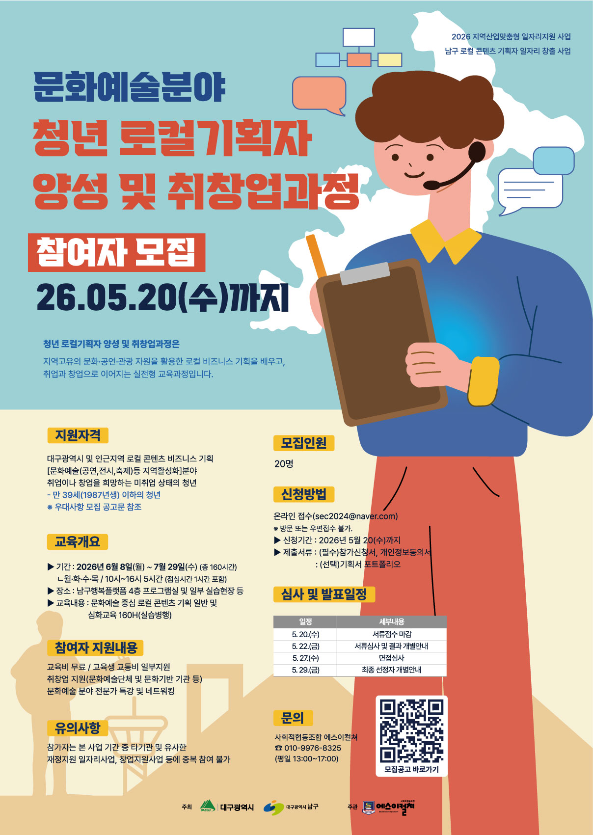 • 기간: 2026년 5월 20일까지 • 대상: 대구 및 인근 거주 미취업 청년 (만 39세 이하) • 혜택: 160시간 교육비 무료, 교통비 및 식비 일부 지원, 취창업 연계 이 프로그램은 지역산업에 맞춤형 일자리를 창출하기 위해 청년을 대상으로 운영됩니다. 참가자들은 전문 교육을 통해 로컬 기획 역량을 강화하고, 취업이나 창업 기회를 제공받습니다. 총 20명을 선발하며, 신청은 이메일로 진행됩니다.