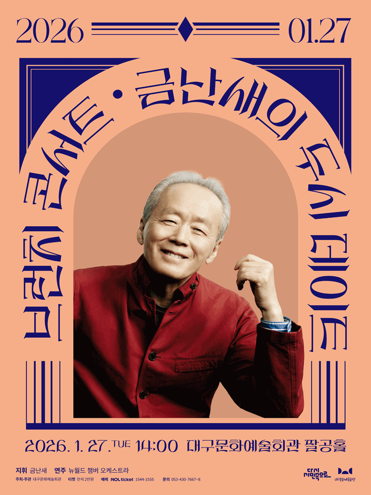 • 기간: 2026.01.27 • 대상: 만 7세 이상 • 장소: 대구문화예술회관 팔공홀 • 티켓 가격: 전석 20,000원 클래식 음악의 매력을 느낄 수 있는 금난새의 두시 데이트가 대구문화예술회관에서 열립니다. 화요일 오후, 아름다운 선율과 함께 특별한 시간을 보내세요. KOPIS(공연예술통합전산망) 제공 공식 정보이며, 예매는 공식 예매처를 통해 가능합니다.