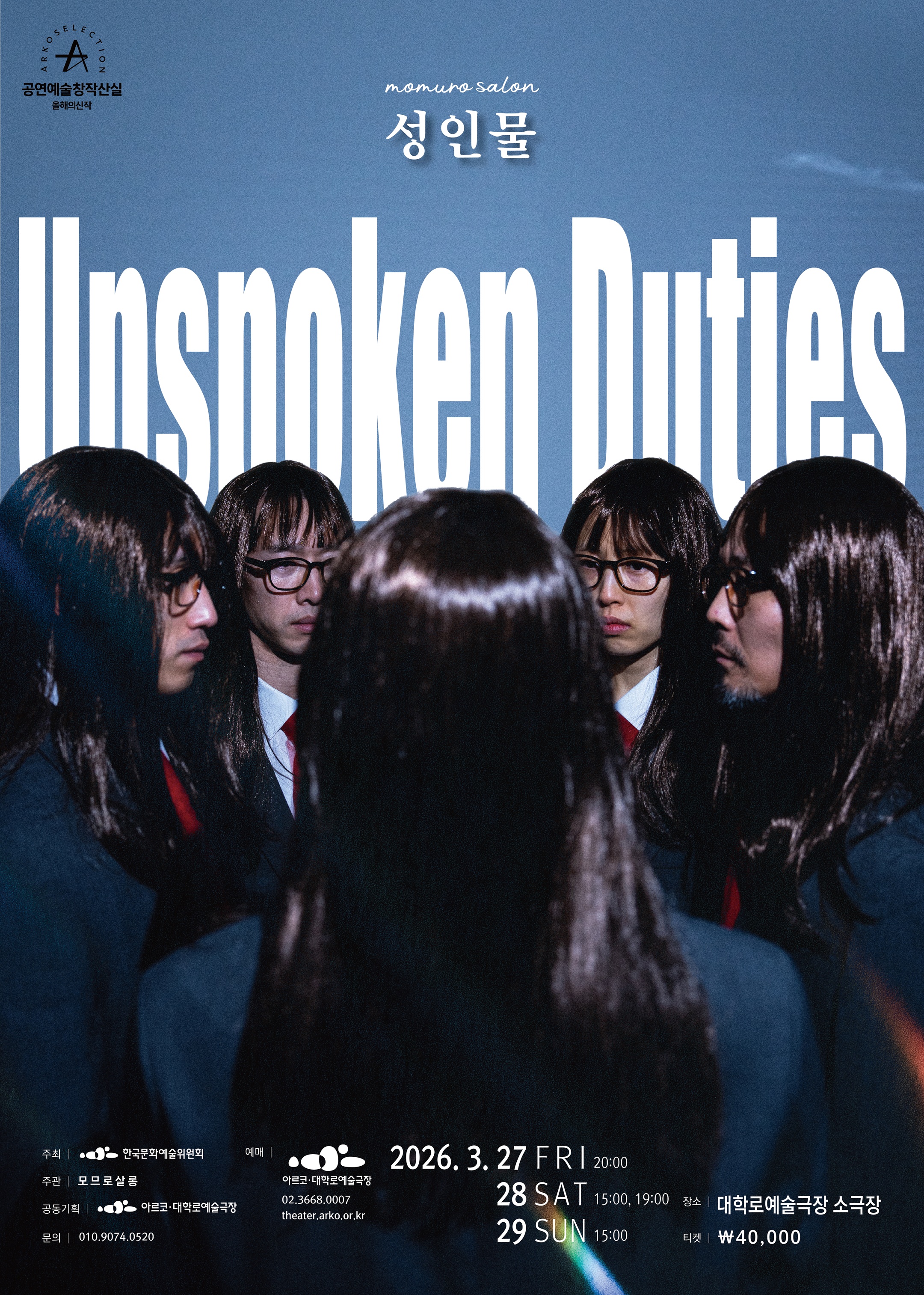 • 기간: 2026.03.27 ~ 2026.03.29 • 대상: 만 7세 이상 • 장소: 대학로예술극장 소극장 • 혜택: 전석 40,000원 한국문화예술위원회의 창작산실 프로그램의 일환으로 진행되는 현대 무용 공연입니다. 서양무용과 한국무용의 요소를 결합하여 모므로살롱만의 독창적인 예술적 세계관과 움직임을 무대 위에서 선보입니다. 대학로예술극장 소극장에서 펼쳐지는 감각적인 퍼포먼스를 통해 무용 예술의 정수를 만끽할 수 있습니다.