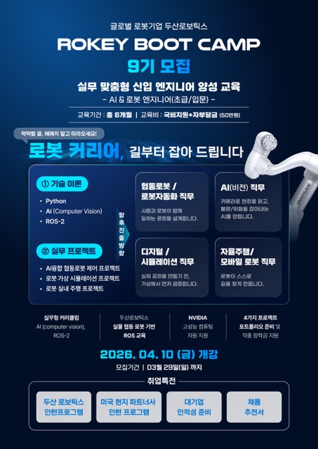 • 기간: 2026.04.10 ~ 2026.10.14 • 대상: 국민내일배움카드 발급 가능한 미취업자 및 졸업(예정)자 • 장소: 온라인(ZOOM) 및 구로 ROKEY 교육장 • 혜택: 교육비 전액 지원, 훈련장려금 지급, 두산로보틱스 인턴십 및 채용 가점 두산로보틱스가 주관하는 로키부트캠프는 협동로봇과 AI 기술을 아우르는 실무형 엔지니어 양성 프로그램입니다. 최신 ROS 프레임워크와 컴퓨터 비전 등 로봇 산업의 필수 기술을 학습하며, 우수 수료생에게는 국내외 인턴십과 채용 혜택을 제공합니다.