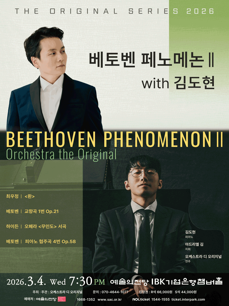 • 기간: 2026.03.04 ~ 2026.03.04 • 대상: 만 7세 이상 관람객 • 장소: 예술의전당 IBK챔버홀 • 혜택: R석 66,000원, S석 44,000원 피아니스트 김도현과 함께 베토벤의 음악적 유산을 깊이 있게 탐구하는 클래식 공연입니다. 베토벤 페노메논 시리즈의 일환으로 정교하고 열정적인 피아노 선율을 직접 감상할 수 있습니다. 예술의전당에서 펼쳐지는 수준 높은 서양음악의 정수를 만나보시기 바랍니다.