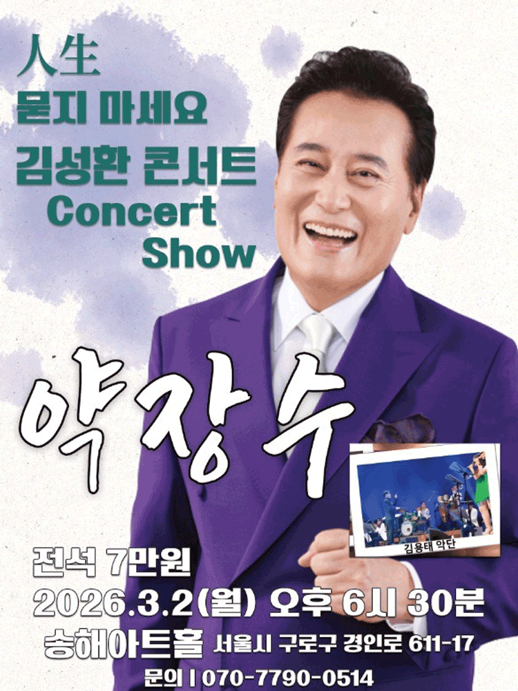 • 기간: 2026.03.02 • 장소: 송해아트홀 공연장 (B1) • 관람 등급: 전체 관람가 • 티켓 가격: 전석 70,000원 가수 김성환의 콘서트가 송해아트홀에서 열립니다. 월요일 저녁, 아름다운 음악과 함께 특별한 시간을 보내세요. 전석 7만원으로, 온 가족이 함께 즐길 수 있는 공연입니다.