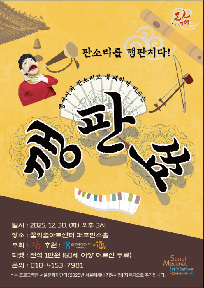 • 공연 일시: 2025년 12월 30일(화) 15:00 • 공연 장소: 꿈의숲아트센터 퍼포먼스홀 • 주소: 서울특별시 강북구 월계로 173 (번동) • 관람 등급: 만 6세 이상 • 티켓 가격: 전석 10,000원 • 장르: 한국음악(국악) 꿈의숲아트센터에서 진행되는 한국음악 공연, 프로젝트 락 깽판쑈입니다. 2025년 12월 30일 화요일 오후 3시에 시작하며, 만 6세 이상 관람 가능합니다. 티켓은 전석 10,000원이며, 자세한 내용 및 예매는 공식 예매처를 통해 확인하시기 바랍니다.