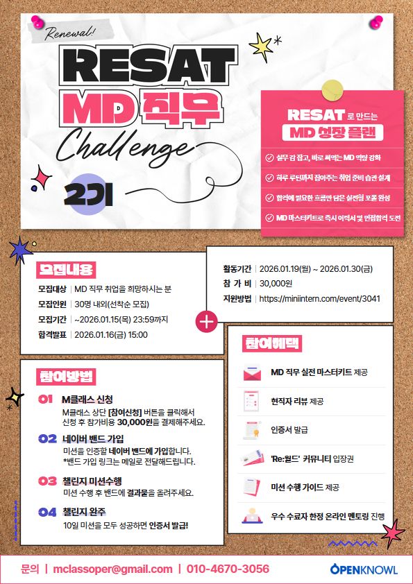• 기간: 2026.01.19(월) ~ 01.30(금) • 대상: MD 직무 취업 준비생 • 혜택: 상품기획서 현직자 리뷰, MD 직무 실전 마스터키트 제공 MD 직무 핵심 역량 강화를 위한 10일 챌린지입니다. 현직자 설계 미션을 통해 실무 역량을 쌓고, 취업에 필요한 상품기획서 리뷰 및 MD 직무 자료를 얻을 수 있습니다. 꾸준한 자기계발 루틴을 만들고 싶은 분들에게 추천합니다.