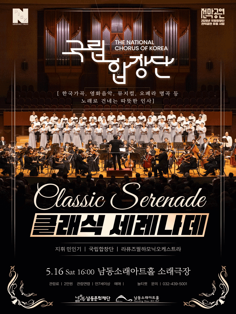 • 기간: 2026.05.16 • 대상: 만 7세 이상 • 장소: 남동소래아트홀 소래극장, 인천광역시 남동구 아암대로1437번길 32 • 혜택: 전석 20,000원 이 공연은 국립합창단이 선보이는 클래식 세레나데로, 서양 음악을 감상할 수 있습니다. 인천의 남동소래아트홀에서 열리며, 가족 단위 관람객에게 적합합니다. 자세한 예매 정보는 공식 채널을 통해 확인하세요.