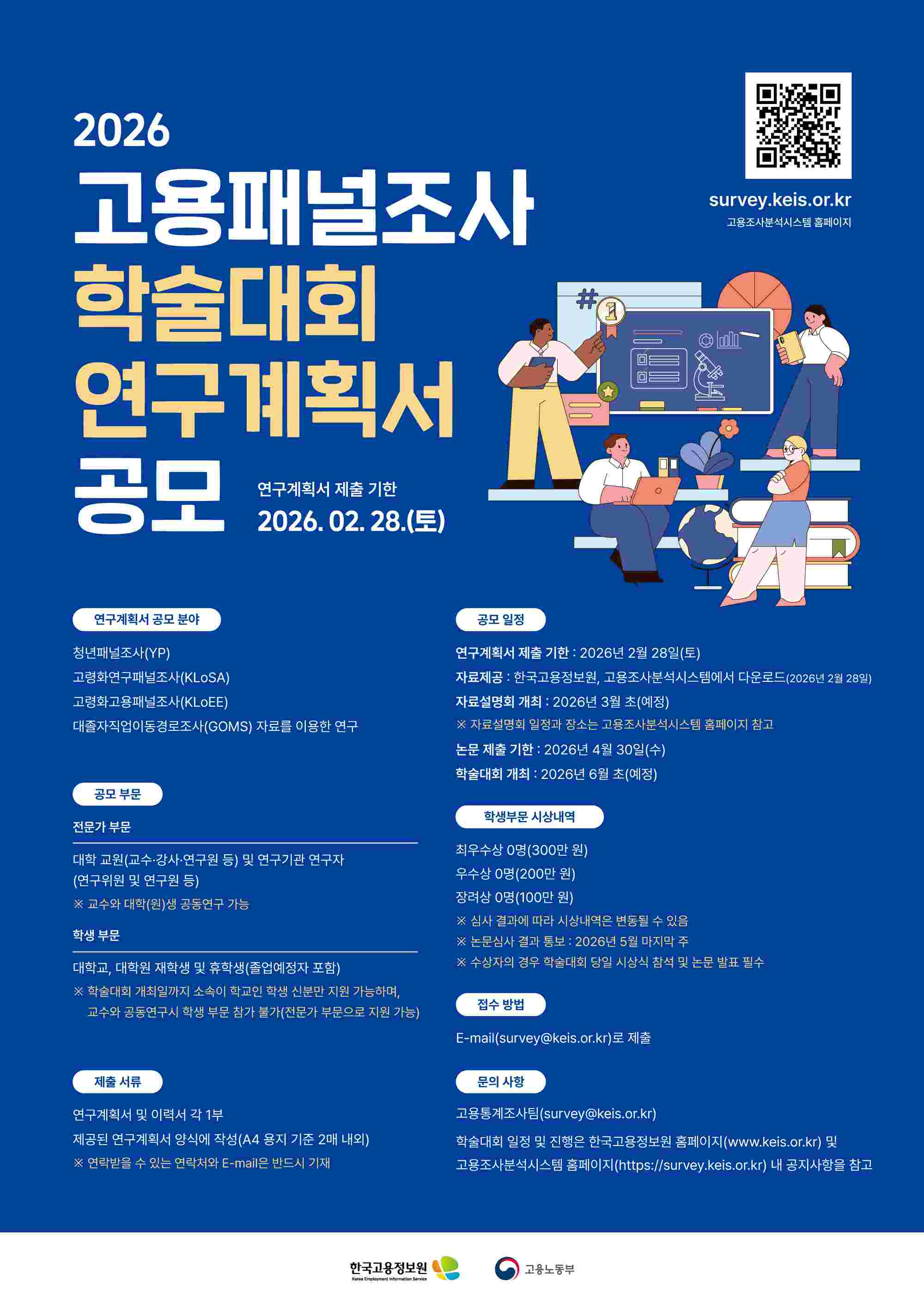 • 기간: 2026년 2월 28일까지 • 대상: 대학 교원, 연구원 및 대학(원)생 • 장소: 이메일 접수 • 혜택: 학술대회 발표 기회 제공 고용노동부와 한국고용정보원에서 주관하는 이번 공모는 청년패널 및 고령화연구패널 등 주요 고용 데이터를 활용한 연구 계획을 모집합니다. 전문가와 학생 부문으로 나누어 진행되며 선정된 연구는 2026년 6월에 개최되는 학술대회에서 발표할 수 있는 기회를 얻습니다. 고용 분야의 심도 있는 분석과 정책 제언에 관심 있는 연구자들의 많은 참여를 바랍니다.