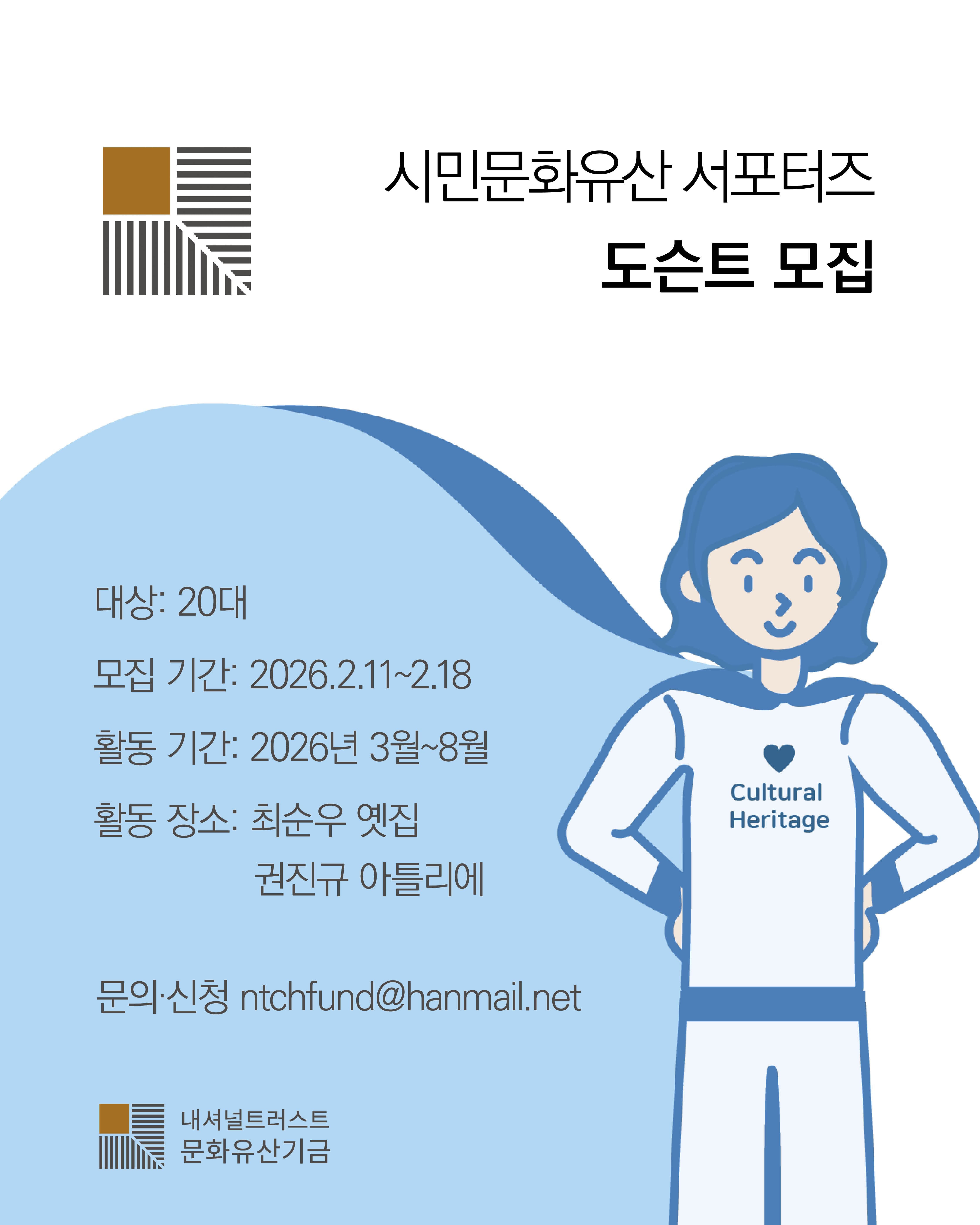 공모개요 시민문화유산 서포터즈 모집! 시민문화유산을 함께 ‘서포트’할 도슨트(문화해설사)를 모집합니다. 시민문화유산이란, 시민들이 직접 지킨 문화유산을 말합니다. 어렵게 지켜낸 시민문화유산의 백 년 미래를 위해 함께 할 서포터즈를 찾고 있습니다. 서울 성북동 최순우 옛집, 전남 나주 도래마을 옛집과 서울 동선동 권진규 아틀리에.총 세 개의 시민문화유산은 '재단법인 내셔널트러스트 문화유산기금'(이하 NT)에서 보전하고 있습니다. 최순우 옛집과 도래마을 옛집은 시민들의 후원금으로 매입, 권진규 아틀리에는 유족이 기증하여 보존한 시민문화유산입니다.1호 최순우 옛집은 미술사학자 최순우 선생의 안목이 자리한 곳으로 박물관으로 운영하며 전시, 교육, 체험 등 다양한 문화 프로그램을 운영하고 있습니다.2호 도래마을 옛집은 전통마을 속 19세기 근대한옥의 모습이 잘 남은 곳으로 전통 문화를 체험하고 한옥 숙박 체험을 할 수 있습니다. 3호 권진규 아틀리에는 조각가 권진규의 예술혼과 숨결이 남아있는 작업실을 정기개방하고, 매년 1명 청년 작가를 공모하여 창작공간을 제공합니다. 공모분야 -서포터즈가 하는 일!<시민문화유산 도슨트(문화해설사)>1. 시민문화유산 1호 최순우 옛집과 3호 권진규 아틀리에 관람객에게 직접 도슨트(문화해설)를 합니다. 내셔널트러스트 운동과 시민문화유산 보존 내용과 방법, 서포터즈 활동 등을 소개합니다. (지원부문 택1, 도슨트 대본 공유)2. 시민문화유산 프로그램에 참여하고 후기로 기록을 남겨 문화유산 아카이브 자료로 활용합니다.3. 문화유산을 아끼는 사람들을 만나고 소통할 수 있습니다. -서포터즈미션!1. 3월 오리엔테이션 참석- 우리 재단이 하는 일, 내셔널트러스트 운동, 시민문화유산 보존 등 활동 전 사전 교육을 합니다. 2. 주기적인 도슨트 활동 (일정협의) 3. 월 1회 이상 시민문화유산 프로그램 참여, 기록(1건 이상)- 활동 시간은 [활동(방문) 시간+ 참여기록 시간]으로 계산하여 1365에 등록합니다. - 참여 기록은 재단 네이버 카페와 인스타그램, 유튜브에 게시됩니다.3. 5월 활동가의 날 참석-서포터즈와 자원활동가가 모여 한 학기 동안 활동 내용을 소개하는 자리입니다. 모집내용 -모집 대상 : 20~29세-모집 분야 : 도슨트(문화해설사)-모집 인원 : 3명 ※적격자가 없으면 선발하지 않습니다.-모집 기간: 2026년 2월11일(수) ~ 2월18일(수)-결과 발표: 2026년 2월19일(목) (개별 연락, 재단 홈페이지와 카페 공지)활동내용-활동기간 : 2026년 3월 ~ 8월※임명 후 1회 이상 활동이 없을 경우 자동 해촉※참여도, 재능, 성실성 등을 고려하여 활동 내용 변경 또는 연장-활동 장소 : 최순우 옛집(서울 성북구), 권진규 아틀리에(서울 성북구)-활동 혜택 :봉사활동 시간 발급(1365, 1일 최대 8시간) 활동 기간 내 프로그램 참여(할인 또는 초청), 활동 수료증과 기념품응모자격-내가 바로 서포터즈!꾸준하고 책임감 있게 활동할 수 있는 분!도슨트(문화해설)로 시민문화유산을 알리고 싶은 분!문화유산과 내셔널트러스트 운동에 관심을 가진 분!한옥을 좋아하고 알리기에 자신 있는 분!개인 SNS 활동이 활발한 분!박물관·미술관 활동을 좋아하는 분! 접수방법 -지원 방법: 첨부파일을 다운로드하여 작성 후 메일(ntchfund@daum.net) 제출 (첨부파일 첨부) 유의사항지원서 작성 시※첨부파일: *메일 제목[서포터즈_지원부문_이름]으로 표기.*지원서 파일명 [지원부문_이름] 작성하여 첨부*SNS나 블로그 글 등 개인의 능력을 참고할 수 있는 간단한 자료 제출※적격자가 없으면 선발하지 않습니다. 문의처 -문의: ntchfund@daum.net-관련 사이트:·네이버 카페: https://cafe.naver.com/ntchfund·홈페이지: http://www.ntculture.or.kr·유튜브: https://www.youtube.com/ntculture·최순우 옛집 인스타: https://www.instagram.com/choisunu_house·내셔널트러스트 문화유산기금 인