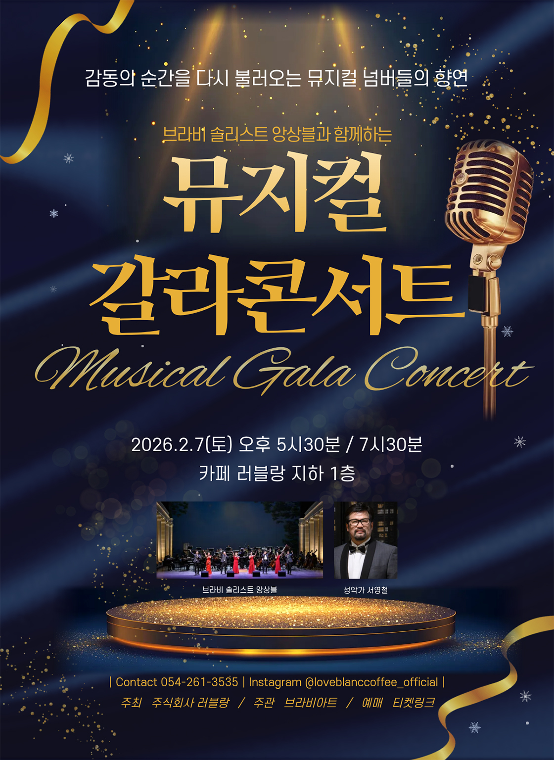 • 기간: 2026.02.07 ~ 2026.02.07 • 대상: 만 7세 이상 관람객 • 장소: 러블랑 포항 • 혜택: R석 티켓 20,000원 브라비 솔리스트 앙상블이 선사하는 화려한 뮤지컬 넘버들을 포항 러블랑에서 만나보실 수 있습니다. 토요일 오후 두 차례에 걸쳐 진행되는 이번 공연은 온 가족이 함께 즐길 수 있는 갈라 콘서트 형식으로 구성되었습니다. 감동적인 무대와 함께 특별한 주말 추억을 만들어 보시기 바랍니다.