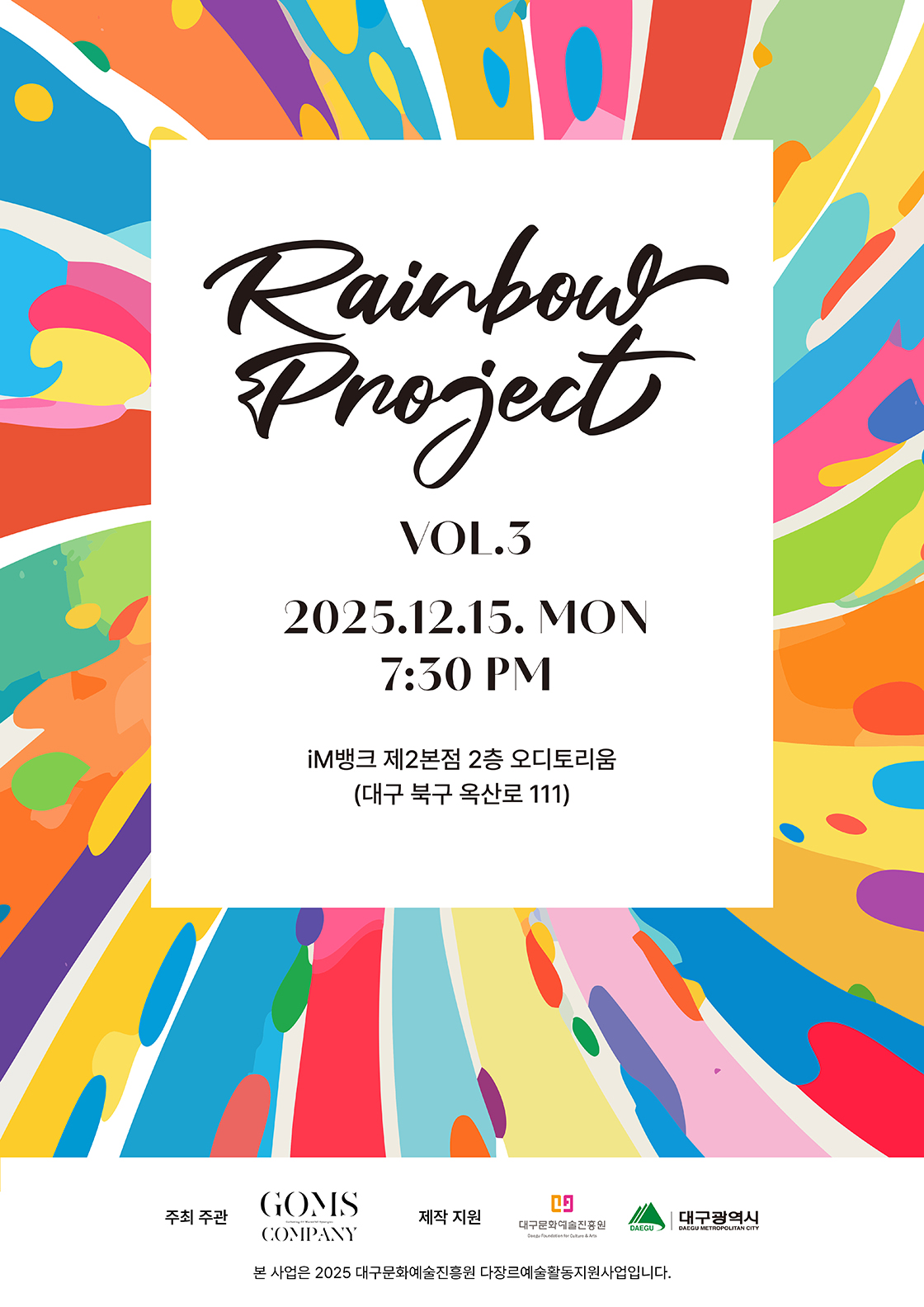 • 공연 일시: 2025년 12월 15일 (월) 19:30 • 공연 장소: 대구은행 제2본점 대강당 (대구광역시 북구 옥산로 111) • 관람 등급: 만 7세 이상 • 티켓 가격: 전석 10,000원 • 장르: 복합 대구은행 제2본점에서 주최하는 레인보우프로젝트 VOL.3 공연입니다. KOPIS(공연예술통합전산망) 공식 정보이며, 상세 내용 확인 및 예매는 공식 예매처를 통해 진행하시기 바랍니다.