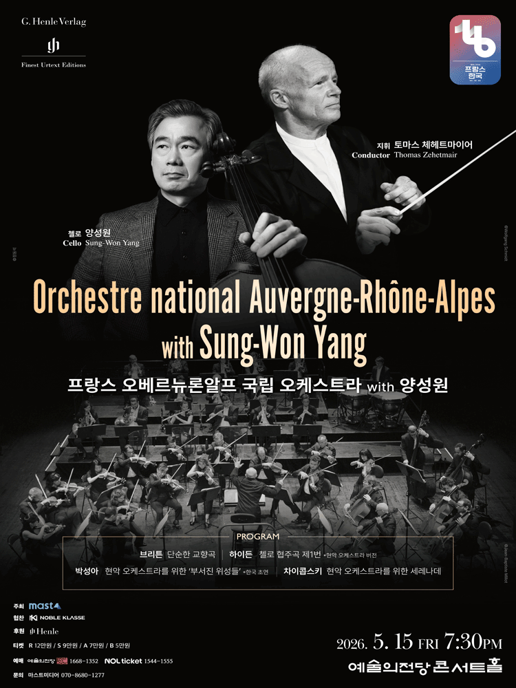 • 기간: 2026.05.15 ~ 2026.05.15 • 대상: 만 7세 이상 관람객 • 장소: 예술의전당 콘서트홀 • 혜택: R석 120,000원, S석 90,000원, A석 70,000원, B석 50,000원 프랑스를 대표하는 오베르뉴론알프 국립 오케스트라가 예술의전당 무대에서 내한 공연을 개최합니다. 정통 서양 클래식 음악의 정수를 느낄 수 있는 이번 공연은 금요일 저녁 관객들에게 깊은 예술적 감동을 선사할 예정입니다. 상세한 프로그램 구성과 예매 관련 사항은 공식 예매처를 통해 확인하시기 바랍니다.