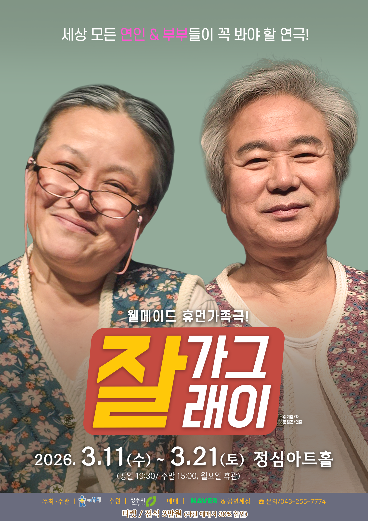 • 기간: 2026.03.11 ~ 2026.03.21 • 대상: 전체 관람가 • 장소: 정심아트홀 • 혜택: 전석 30,000원 청주 정심아트홀에서 상연되는 연극 잘 가그래이는 전 연령층이 함께 관람할 수 있는 문화 공연입니다. 평일 저녁과 주말 오후 시간대에 운영되어 일상 속에서 편안하게 연극을 즐길 수 있는 기회를 제공합니다. 상세한 공연 정보 확인과 예매는 공식 예매처를 통해 진행하시기 바랍니다.
