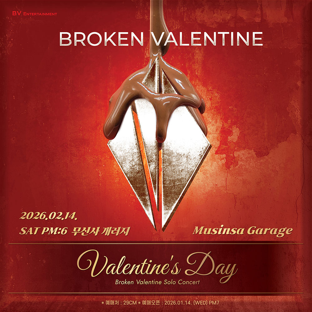 • 기간: 2026.02.14 • 대상: 만 12세 이상 관람가 • 장소: 무신사 개러지 • 혜택: 전석 88,000원 밴드 브로큰 발렌타인이 발렌타인 데이를 맞아 개최하는 특별한 단독 공연입니다. 서울 마포구에 위치한 무신사 개러지에서 밴드 특유의 강렬한 사운드와 감성적인 무대를 직접 경험할 수 있습니다. 티켓 예매 및 상세 정보는 공식 예매처와 KOPIS 홈페이지를 통해 확인이 가능합니다.
