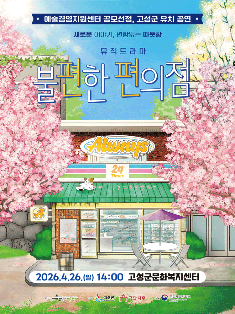 • 기간: 2026.04.26 ~ 2026.04.26 • 대상: 만 7세 이상 관람객 • 장소: 고성군문화복지센터 대공연장 • 혜택: 전석 10,000원 관람 베스트셀러 소설을 원작으로 한 인기 연극 불편한 편의점이 강원도 고성에서 무대에 오릅니다. 우리 주변의 따뜻한 이웃 이야기를 담아 전 세대가 공감할 수 있는 감동과 위로를 선사합니다. 합리적인 가격으로 수준 높은 문화 공연을 즐길 수 있는 특별한 기회입니다.