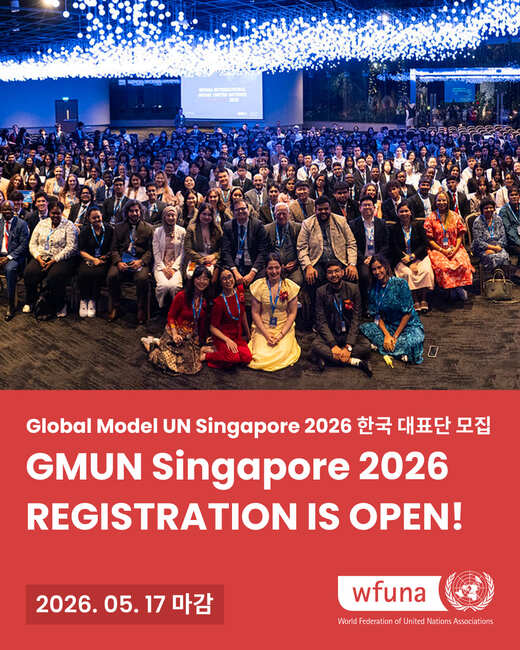 • 기간: 2026년 8월 11일 ~ 2026년 8월 16일 • 대상: 고등학생 및 대학(원)생 • 장소: 싱가포르 Suntec City Convention Centre • 혜택: WFUNA 공식 수료증 발급 및 전문가 강연 제공 유엔협회세계연맹이 주최하는 국제 모의유엔 컨퍼런스로 실제 UN 시스템과 절차를 바탕으로 운영됩니다. 참가자들은 전 세계 청년들과 함께 국제 이슈를 논의하며 외교적 협상력과 리더십을 기를 수 있습니다. 전문가 강연과 네트워킹을 포함한 5일간의 프로그램을 통해 글로벌 인재로 성장하는 기회를 제공합니다.