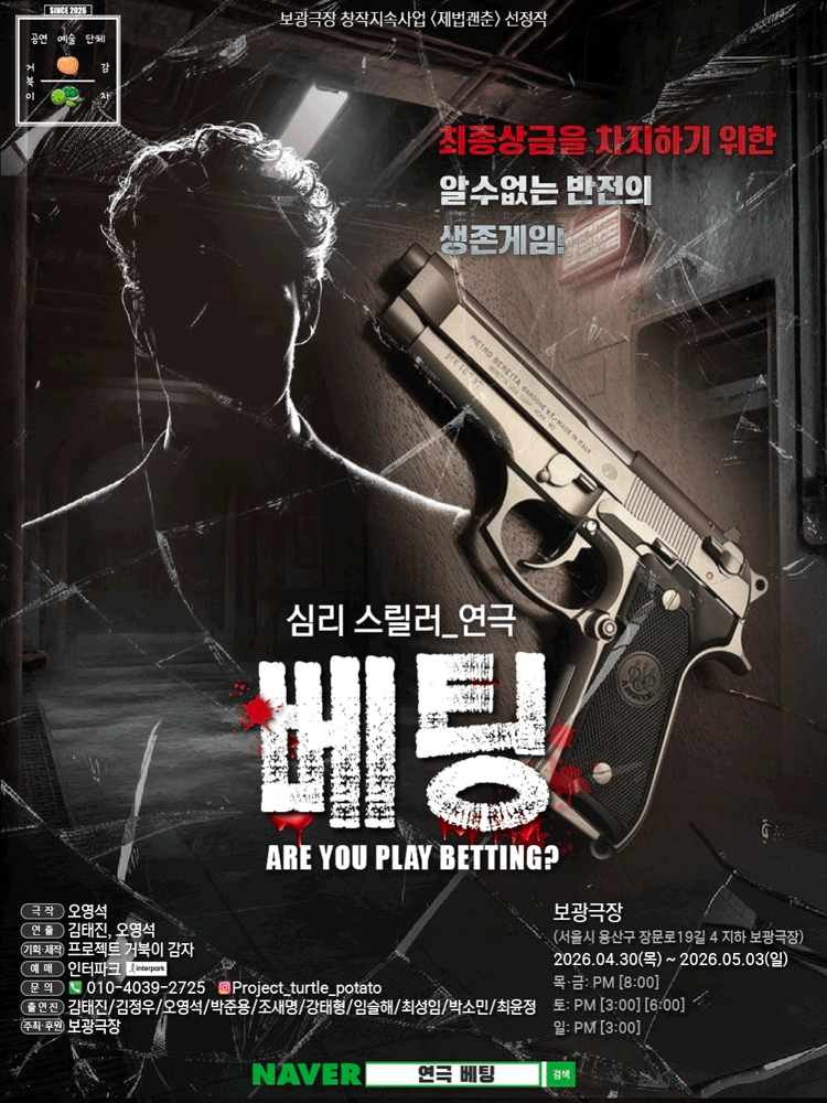• 기간: 2026.04.30 ~ 2026.05.03 • 대상: 만 14세 이상 • 장소: 보광극장 • 혜택: 전석 30,000원 보광극장에서 상연되는 연극 베팅은 서울 용산구 보광동 무대에서 관객들과 만납니다. 목요일부터 일요일까지 총 4일간 진행되며 회차별로 다양한 공연 시간이 마련되어 있습니다. 만 14세 이상이라면 누구나 관람할 수 있으며 공식 예매처를 통해 티켓 예매가 가능합니다.