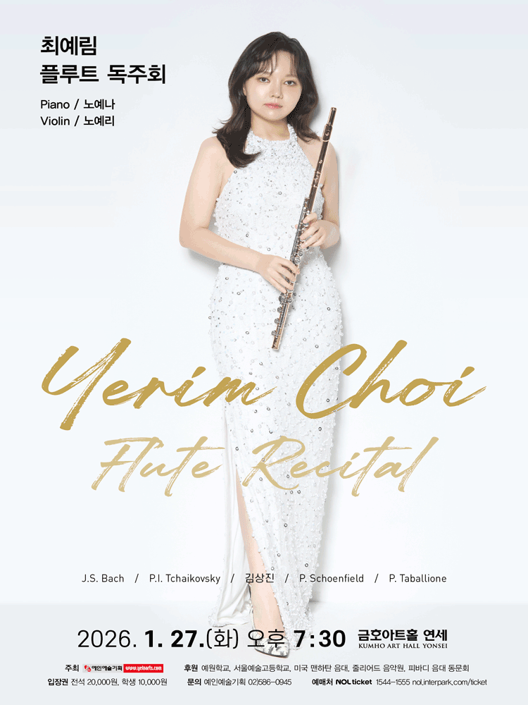 • 공연 일시: 2026년 1월 27일 (화) 19:30 • 공연 장소: 금호아트홀 연세 • 관람 등급: 만 7세 이상 • 티켓 가격: 전석 20,000원 • 장르: 서양음악(클래식) 최예림 플루트 독주회가 금호아트홀 연세에서 개최됩니다. KOPIS 제공 정보를 참고하여 공식 예매처를 통해 예매하시기 바랍니다.