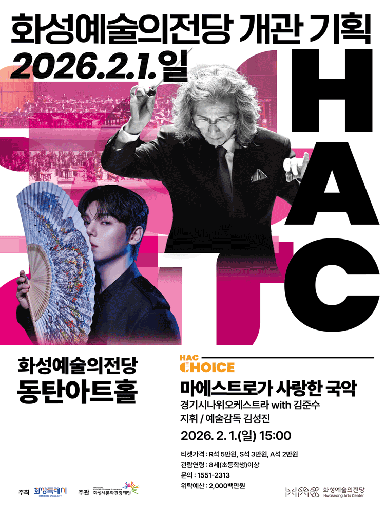 • 기간: 2026.02.01 • 장소: 화성예술의전당 동탄아트홀 • 대상: 만 7세 이상 관람 가능 • 가격: R석 50,000원, S석 30,000원, A석 20,000원 화성예술의전당 개관기획 HAC 초이스로 경기시나위오케스트라와 김준수가 함께하는 국악 공연이 펼쳐집니다. 마에스트로가 사랑한 국악이라는 부제처럼, 깊이 있는 한국 음악의 매력을 느낄 수 있는 특별한 시간이 될 것입니다. 2026년 2월 1일, 화성예술의전당에서 감동의 선율을 만나보세요.