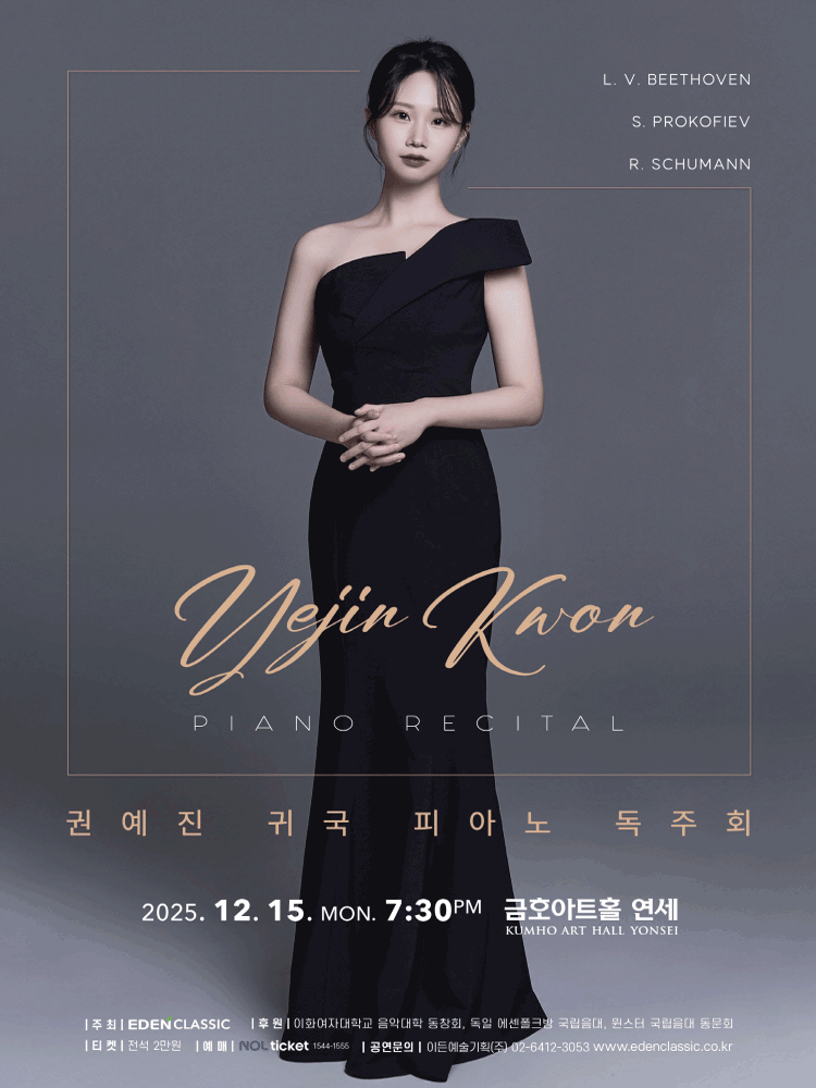 • 공연 일시: 2025년 12월 15일 (월) 19:30 • 공연 장소: 금호아트홀 연세 • 관람 등급: 만 7세 이상 • 티켓 가격: 전석 20,000원 • 장르: 클래식 피아니스트 권예진의 귀국 독주회가 금호아트홀 연세에서 열립니다. KOPIS(공연예술통합전산망) 제공 정보이며, 예매는 공식 예매처를 통해 확인하시기 바랍니다.