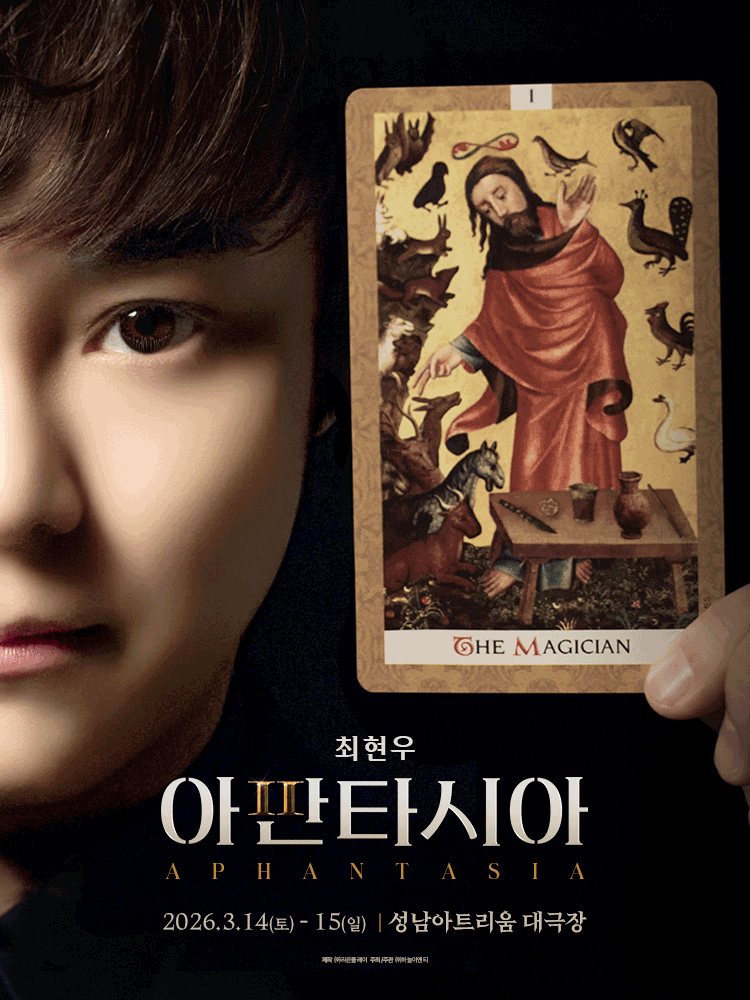 • 기간: 2026.03.14 ~ 2026.03.15 • 대상: 만 13세 이상 • 장소: 성남아트리움 대극장 (경기도 성남시 수정구) • 가격: R석 99,000원 최현우 마술사의 아판타시아 공연이 성남아트리움에서 펼쳐집니다. 환상적인 마술의 세계로 여러분을 초대합니다. 토요일과 일요일, 다양한 시간대에 공연이 준비되어 있으니 많은 관심 부탁드립니다.