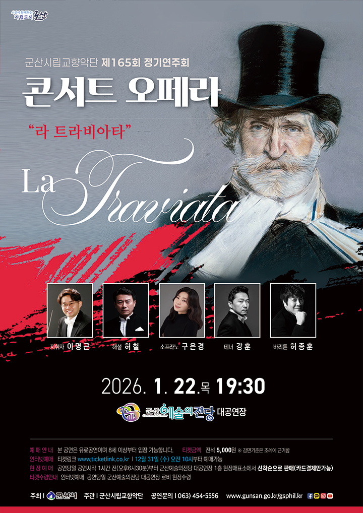 • 기간: 2026.01.22 • 장소: 군산예술의전당 대공연장 (전라북도 군산시 백토로 203) • 대상: 만 7세 이상 관람 가능 • 티켓: 전석 5,000원 군산시립교향악단의 제165회 정기연주회가 '라 트라비아타'를 주제로 군산예술의전당에서 개최됩니다. 아름다운 선율과 감동적인 이야기를 통해 깊어가는 겨울밤을 따뜻하게 채워줄 공연입니다. 클래식 음악의 매력을 느껴보세요.
