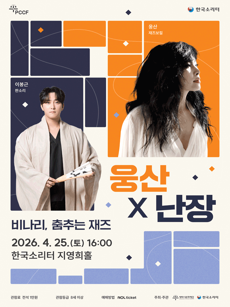 • 기간: 2026.04.25 ~ 2026.04.25 • 대상: 만 7세 이상 관람객 • 장소: 한국소리터 지영희홀 • 혜택: 전석 10,000원 관람 혜택 재즈 보컬리스트 웅산과 국악 난장이 어우러져 비나리와 재즈의 선율을 선보이는 특별한 공연입니다. 한국소리터 지영희홀에서 펼쳐지는 이번 무대는 전통 음악과 현대적 재즈의 조화를 경험할 수 있는 기회를 제공합니다. 합리적인 가격으로 수준 높은 크로스오버 공연을 즐길 수 있는 문화 행사입니다.
