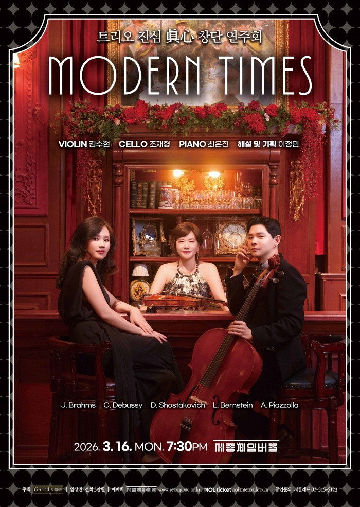 • 기간: 2026.03.16 ~ 2026.03.16 • 대상: 만 7세 이상 관람가 • 장소: 세종문화회관 세종체임버홀 • 혜택: 전석 30,000원 트리오 진심의 새로운 시작을 알리는 창단 연주회가 세종문화회관에서 개최됩니다. 정통 클래식의 깊이 있는 선율을 통해 관객들에게 진심 어린 감동을 선사할 예정입니다. 월요일 저녁 아름다운 실내악의 세계를 경험하며 특별한 시간을 보내시기 바랍니다.
