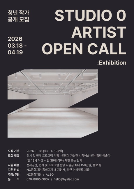 • 기간: 2026. 3. 18. ~ 4. 19. • 대상: 시각예술 분야 청년 예술가 (만 19세~39세) • 장소: NC문화재단 Studio White • 혜택: 창작지원금 100만원 및 전시 공간 지원 NC문화재단에서 청년 예술가의 실험적인 창작 활동을 지원하기 위해 스튜디오 제로 전시 공모를 진행합니다. 선정된 예술가에게는 전시 공간과 창작지원금뿐만 아니라 전시 연계 프로그램 운영비와 홍보물 제작 등을 다각도로 지원합니다. 시각예술 전 분야에서 자신만의 작업 세계를 확장하고자 하는 창의적인 예술가들의 많은 참여를 바랍니다.