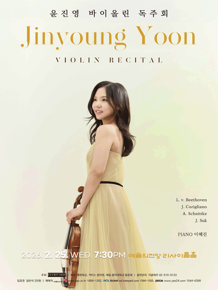 • 기간: 2026.02.25 • 대상: 만 7세 이상 • 장소: 예술의전당 리사이틀홀 • 티켓: 전석 20,000원 바이올리니스트 윤진영의 독주회가 예술의전당에서 열립니다. 섬세하고 깊이 있는 연주를 통해 클래식 음악의 아름다움을 느껴보세요. 수요일 저녁, 아름다운 선율과 함께하는 특별한 시간을 선사합니다.