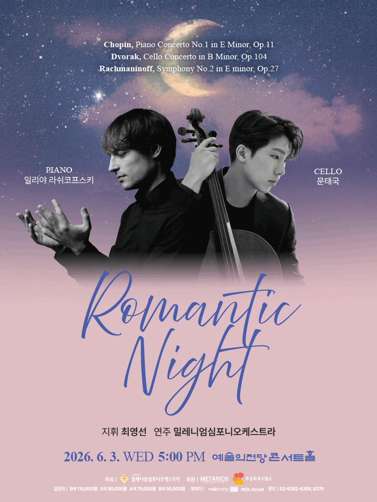 • 기간: 2026.06.03 ~ 2026.06.03 • 대상: 만 7세 이상 • 장소: 예술의전당 콘서트홀 • 혜택: R석 110,000원, S석 90,000원, A석 70,000원, B석 50,000원 예술의전당 콘서트홀에서 펼쳐지는 클래식 음악회로 낭만적인 밤의 선율을 선사합니다. 수요일 오후에 진행되는 이번 공연은 초등학생 이상 관람 가능하며 다양한 등급의 좌석이 마련되어 있습니다.
