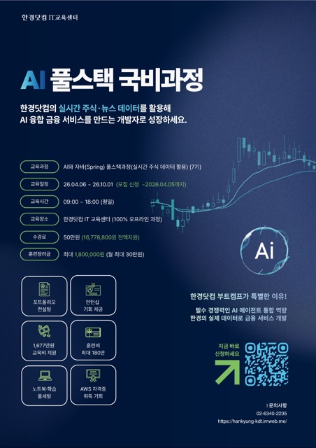 • 기간: 2026.04.06 ~ 2026.10.01 • 대상: 취업준비생, 일반 구직자, 내일배움카드 소지자 • 장소: 한경닷컴IT교육센터 교육장 • 혜택: 훈련장려금 최대 180만원 지급 및 인턴십 연계 실제 주식 데이터를 활용하여 백엔드부터 AI 서비스 구현까지 경험할 수 있는 실무 중심의 풀스택 개발자 양성 과정입니다. 자바 스프링 기반의 웹 개발 역량과 파이썬 기반의 AI 에이전트 기술을 동시에 습득하여 금융 도메인에 특화된 포트폴리오를 제작할 수 있습니다. 교육비 지원과 함께 노트북 제공, AWS 자격증 취득 지원 등 다양한 혜택을 통해 수강생의 성장을 밀착 지원합니다.