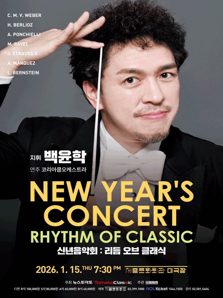 • 공연 일시: 2026년 1월 15일 (목) 19:30 • 공연 장소: 세종문화회관 세종대극장 • 관람 등급: 만 6세 이상 • 티켓 가격: R석 100,000원, S석 80,000원, A석 60,000원, B석 40,000원 • 장르: 클래식 세종문화회관에서 주최하는 신년음악회, '리듬 오브 클래식'이 2026년 1월 15일에 개최됩니다. 아름다운 클래식 선율과 함께 특별한 새해를 맞이해보세요. 자세한 공연 정보 및 예매는 공식 예매처를 통해 확인하실 수 있습니다.