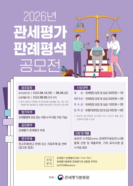 • 기간: 2026년 4월 14일 ~ 2026년 9월 30일 • 대상: 관세행정에 관심 있는 누구나 (3인 이내 팀) • 장소: 온라인 • 혜택: 대상 300만원 상금 및 상장 이 공모전은 관세평가 판례를 주제로 한 평석을 제출하는 행사입니다. 참가자는 대법원 판례를 참조해 A4 15매 내외로 작성하며, 요약서를 필수로 첨부해야 합니다. 상금과 상장이 수여되어 참가자에게 동기를 부여합니다.