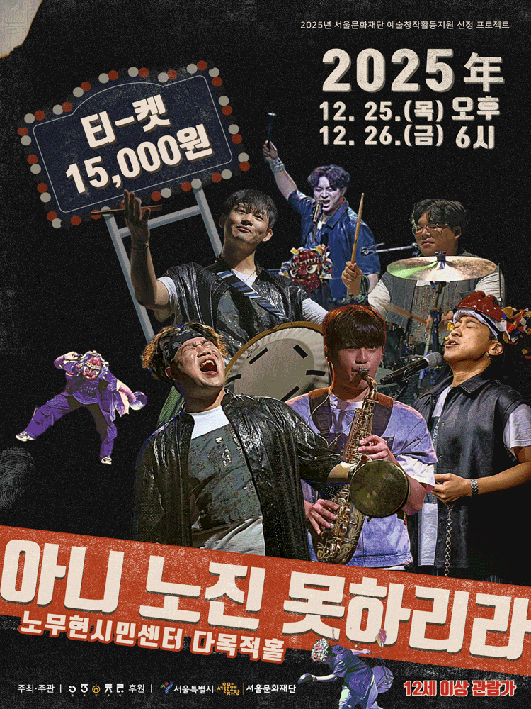 • 기간: 2025.12.25 ~ 2025.12.26 • 대상: 만 11세 이상 • 장소: 노무현시민센터 다목적홀 가치하다 (서울특별시 종로구 창덕궁길 73) • 가격: 전석 15,000원 노무현시민센터에서 한국음악(국악) 공연 '아니 노진 못하리라'가 개최됩니다. 2025년 12월 25일과 26일, 노무현시민센터 다목적홀에서 만나보실 수 있습니다. 만 11세 이상 관람 가능하며, 티켓 가격은 전석 15,000원입니다.