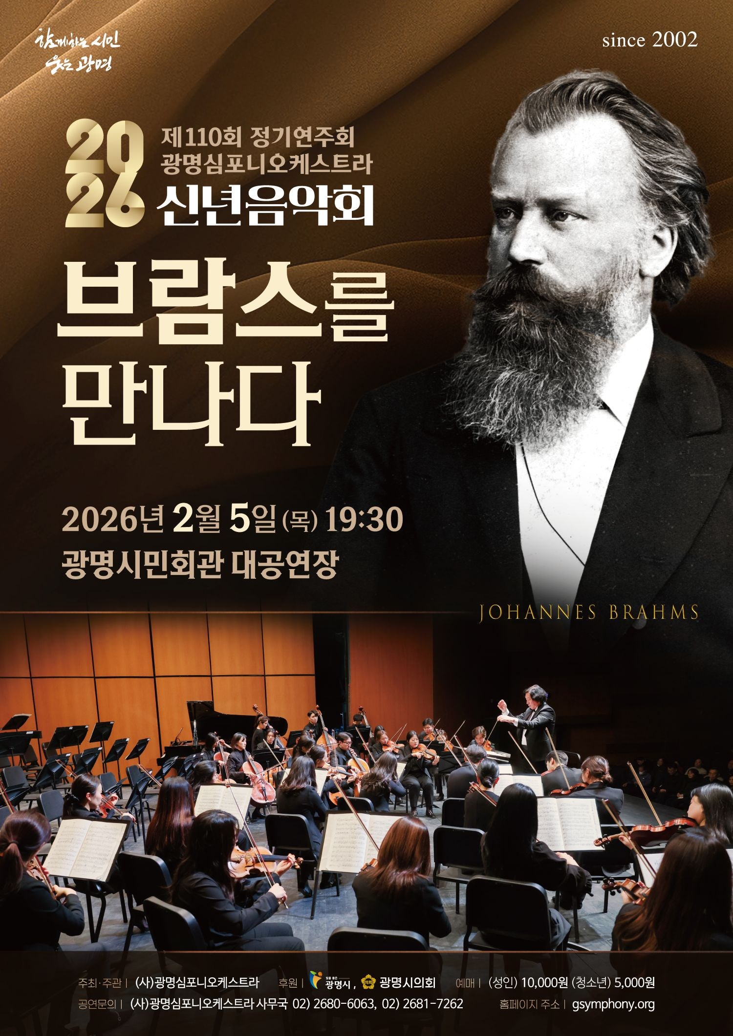 • 기간: 2026.02.05 ~ 2026.02.05 • 대상: 만 4세 이상 관람객 • 장소: 광명시민회관 대공연장 • 혜택: 전석 10,000원 관람 광명심포니오케스트라가 2026년 새해를 맞아 브람스의 음악 세계를 조명하는 정기연주회를 개최합니다. 전문 오케스트라의 깊이 있는 연주를 통해 클래식의 정수를 느끼며 희망찬 한 해를 시작할 수 있는 특별한 시간을 선사합니다.