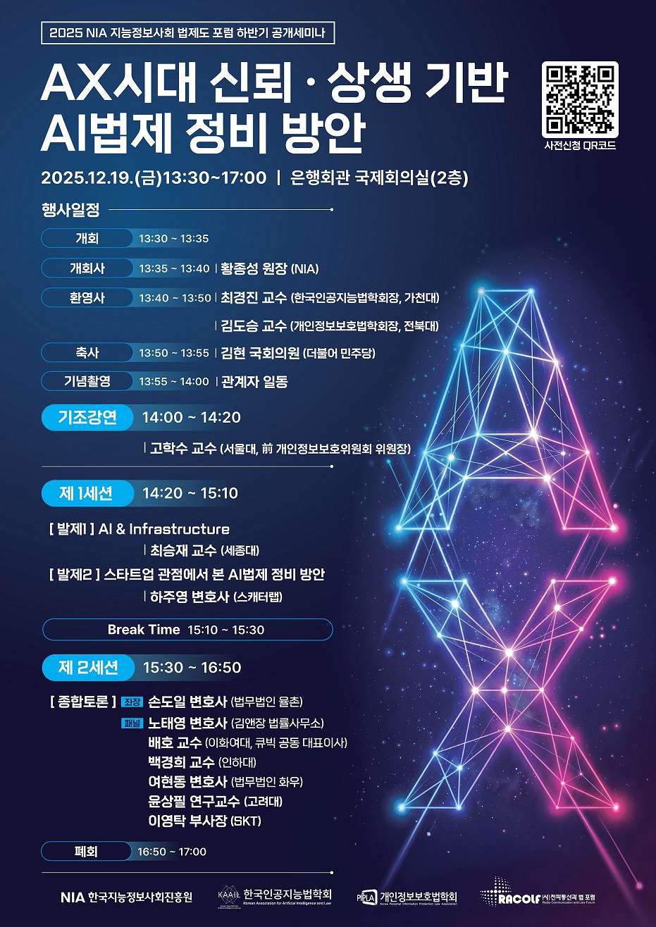 • 일시: 2025년 12월 19일(금) 13:30~17:00 • 장소: 은행회관 2층 국제회의실 (온·오프라인 병행) • 주제: AX시대, 신뢰·상생 기반 AI법제 정비 방안 • 신청 방법: https://naver.me/x9zG2k66 한국지능정보사회진흥원에서 AX시대 신뢰와 상생을 기반으로 하는 AI 법제 정비 방안을 논의하는 공개 세미나를 개최합니다. AX 시대 3대 강국 도약을 위한 인프라 구축 전략과 산업 생태계 상생을 위한 AI 법제 정비 방안 등 핵심 이슈를 다룰 예정입니다. 많은 관심과 참여 바랍니다.
