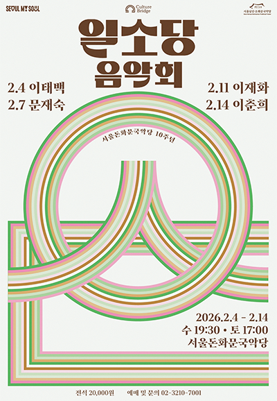 • 기간: 2026.02.04 ~ 2026.02.14 • 대상: 전체 관람가 • 장소: 서울돈화문국악당 • 혜택: 전석 20,000원 서울돈화문국악당에서 열리는 일소당 음악회는 한국 전통 음악의 정수를 느낄 수 있는 국악 공연입니다. 수요일 저녁과 토요일 오후에 진행되며 남녀노소 누구나 즐길 수 있는 다채로운 무대를 선보입니다. 도심 속 고즈넉한 공연장에서 국악의 깊은 울림과 아름다움을 직접 경험해 보시기 바랍니다.