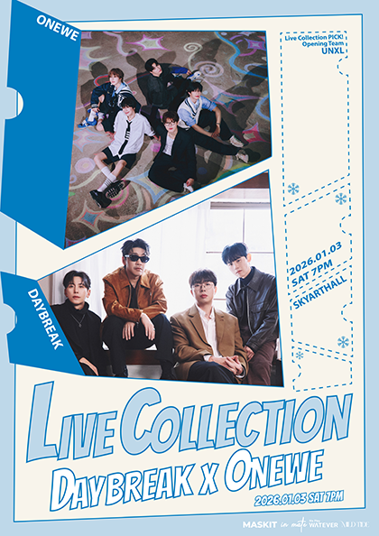 • 공연 일시: 2026년 1월 3일 (토) 19:00 • 공연 장소: 스카이아트홀 (서울특별시 강서구 화곡로63길 65) • 관람 등급: 만 6세 이상 • 티켓 가격: R석 110,000원, S석 99,000원 • 장르: 대중음악 ONEWE와 DAYBREAK의 합동 공연 Live Collection이 스카이아트홀에서 개최됩니다. KOPIS 공연예술통합전산망 제공 정보이며, 예매는 공식 예매처를 통해 진행됩니다.