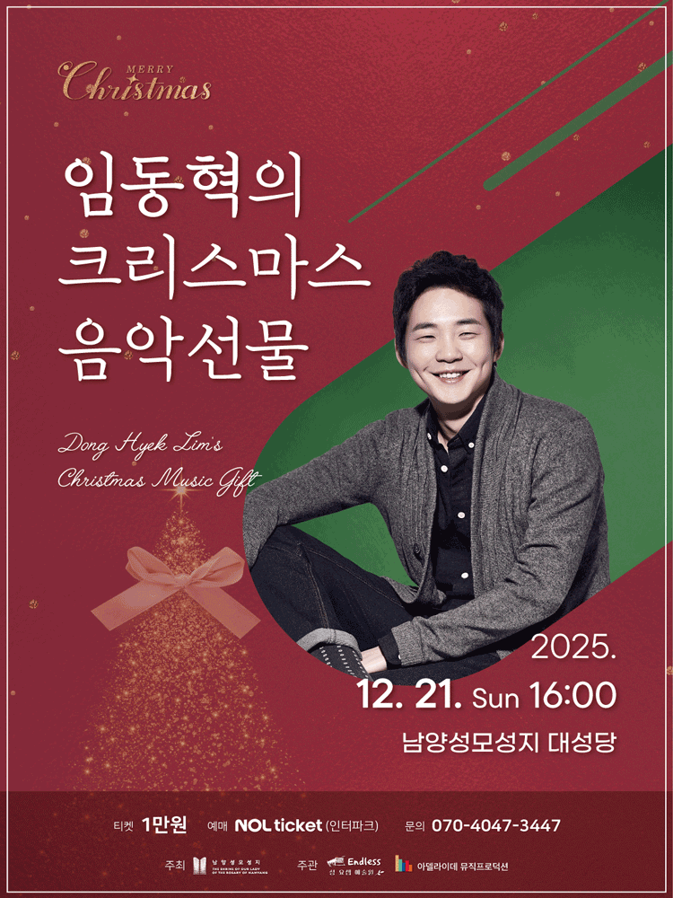 • 공연 일시: 2025년 12월 21일 (일) 16:00 • 공연 장소: 남양성모성지 대성당 (경기도 화성시 남양읍 남양성지로 112) • 관람 등급: 만 8세 이상 • 티켓 가격: 전석 10,000원 • 장르: 클래식 피아니스트 임동혁의 크리스마스 특별 공연이 화성 남양성모성지에서 열립니다. 아름다운 선율과 함께 따뜻한 연말을 보내세요. 자세한 정보 확인 및 예매는 공식 예매처를 통해 진행하시기 바랍니다.