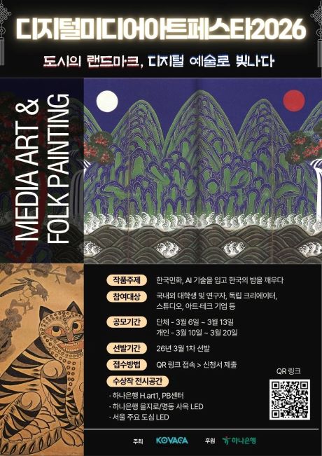 • 기간: 2026년 3월 6일 ~ 2026년 8월 • 대상: 디지털 콘텐츠 및 미디어아트 분야에 관심 있는 아마추어 작가 • 장소: 하나은행 하트원(H.art1) 및 온라인 • 혜택: 공식 전시 참여, 공모전 시상, 전속 작가 연계 및 수료증 발급 한국 민화의 재해석을 주제로 3D 엔진 기반의 디지털 미디어 아트 창작자를 육성하기 위한 공모전입니다. 참가자들에게는 온라인 기초 교육과 오프라인 실습 교육을 제공하여 작품의 완성도를 높일 수 있도록 지원합니다. 최종 선발된 작품은 실제 전시 기회와 함께 국내 미디어아트 전문가와의 연계 혜택을 받을 수 있습니다.