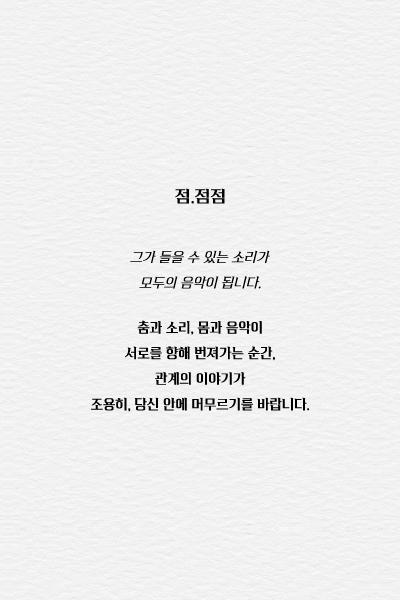 • 기간: 2025.12.26 ~ 2025.12.27 • 장소: 윈드밀 (서울특별시 용산구 원효로 13 청암동) • 관람 등급: 만 7세 이상 • 티켓 가격: 전석 20,000원 윈드밀에서 펼쳐지는 무용 공연 '점.점점'입니다. 금요일 저녁과 토요일 오후, 아름다운 무용의 향연을 즐겨보세요. 서양 및 한국 무용의 조화로운 무대를 통해 깊은 감동을 선사할 예정입니다.