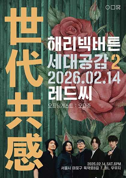 • 기간: 2026.02.14 ~ 2026.02.14 • 대상: 전체 관람가 • 장소: 우무지 (서울특별시 마포구 독막로8길 7) • 혜택: 전석 35,000원 밴드 레드씨와 해리빅버튼이 함께 무대를 꾸미는 세대공감 시리즈의 두 번째 공연이 개최됩니다. 합정동에 위치한 공연장 우무지에서 강렬한 대중음악의 진수를 라이브로 경험할 수 있습니다. 전 연령이 관람 가능한 이번 공연의 상세 정보와 예매는 공식 예매처를 통해 확인하시기 바랍니다.