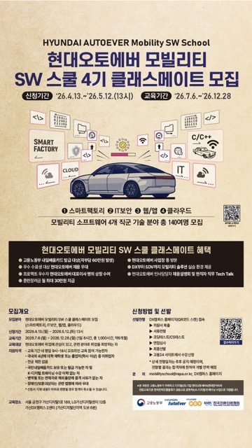 • 기간: 2026.7.6 ~ 2026.12.28 • 대상: 국민내일배움카드 보유 또는 발급 가능자, K-디지털트레이닝 수강 이력 없는 자 등 • 장소: 서울 금천구 가산디지털센터 12층 • 혜택: 훈련장려금 최대 월 30만원, 채용 우대, 상장 수여 등 이 프로그램은 고용노동부가 주최하는 디지털 교육으로 현대오토에버와 협력합니다. 웹, 앱, 스마트팩토리, 클라우드, IT보안 분야를 학습할 수 있습니다. 수료 후 채용 우대와 프로젝트 우수자 상장이 제공됩니다.